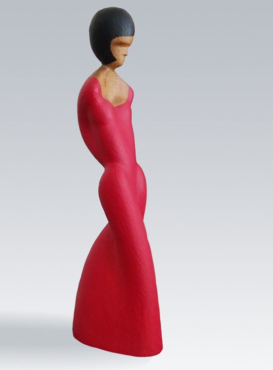 David Hostetler (1926-2015) was a professor of sculpture at Ohio University. He primarily created artworks from hard wood, with female forms comprising a significant part of his art. In this particular work, the silhouette and the hemline of the female figure's red dress give a sense of movement.