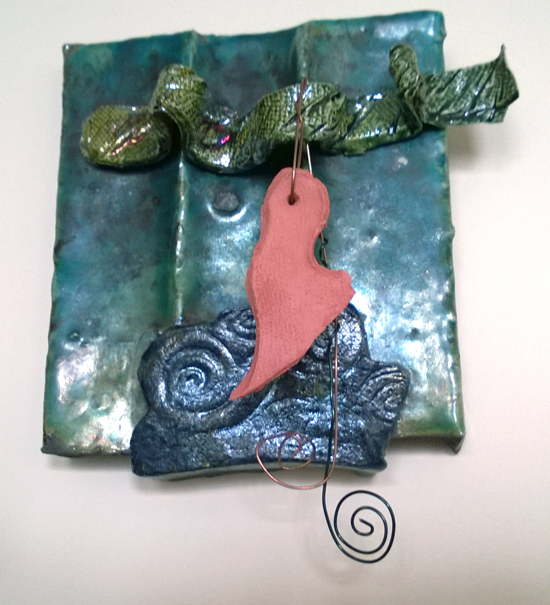 Ceramics and raku seem to be always present, in addition to Peggy Sibila’s mixed-media works. Peggy Sibila appears a master at making commentary about some widely concerned issues in an unconventional way. In Global Warming, Sibila adapted a number of methods which she is expert at, including the mixture of two-dimensional and three-dimensional, as well as the mixture of media. This work is principally done with painting on panel, ceramics, and metal parts.