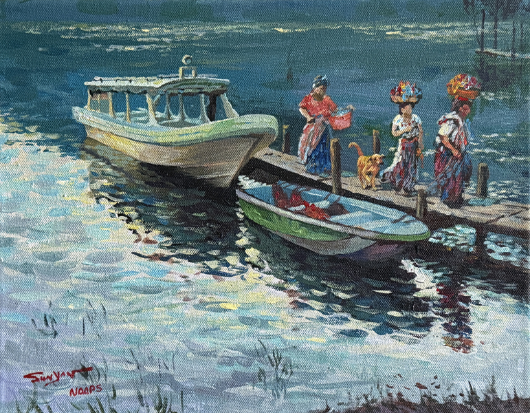 Yan Sun’s acrylic painting, “Going to the Market,” depicts a quiet moment by the lakeside in Guatemala. Three women, dressed in traditional attire, walk together toward the market, their dog following closely beside them. The soft, fluid application of acrylic paint gives the work a watercolor-like quality, enhancing the tranquil atmosphere of the scene. The reflections in the water and the gentle ripples further evoke a sense of calm and movement, while the women’s connection to each other and their surroundings is beautifully portrayed.