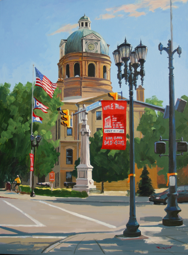 Yan Sun's "New Philadelphia, Ohio" captures the spirit of Tuscarawas County Courthouse. This acrylic painting presents a festive scene adorned with the American flag, Ohio flag, and vibrant banners, set amidst the surrounding trees. Yan Sun has brought forth the patriotic grandeur of this Ohio landmark, celebrating both local and national heritage.
