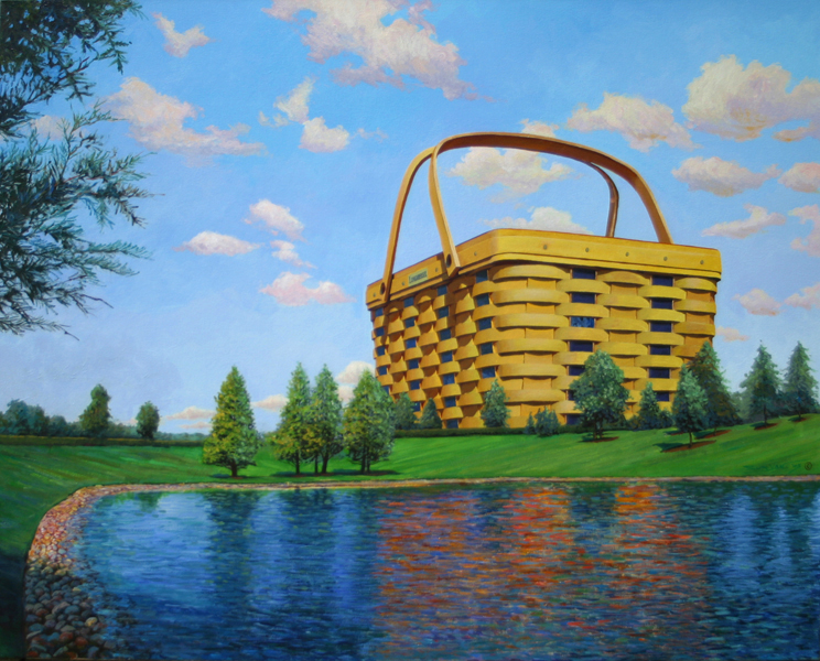 Yan Sun's painting showcases the remarkable Longaberger Company building, ingeniously designed in the shape of a basket. This distinctive structure is perfectly reflected in the serene waters of the foreground lake. Against a background of blue skies and gentle clouds, Sun's painting captures a harmonious blend of architectural innovation and natural beauty.