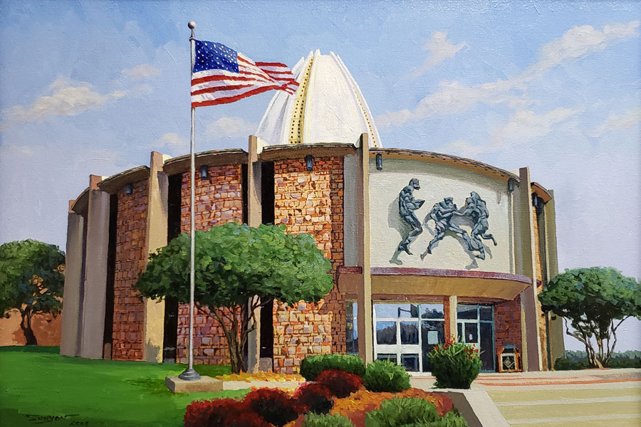 Yan Sun loves Ohio, and this beautiful buckeye state becomes the subject matter of many of his original acrylic and oil paintings, featuring landscapes, cityscapes, and lakescapes. This particular acrylic landscape painting portrays the Pro Football Hall of Fame in great detail, with an American flag flying against the blue sky.