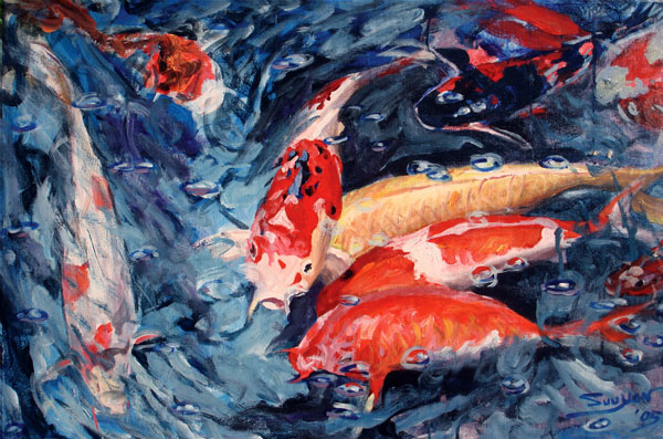 This acrylic painting has captured the lively movement of fish playing in the pond. The vibrant colors and flying brushstrokes are perfect for such a subject matter.