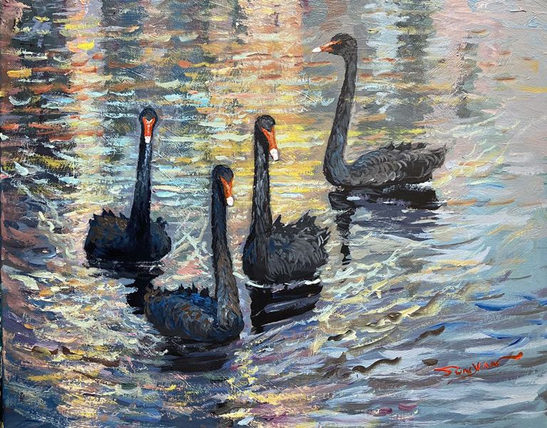 A nature lover, Yan Sun often finds inspiration and beauty within the natural wonders of lakes and rivers. “Swan Lake” is a unique piece to highlight this visual pleasure. Although there is a very animated color contrast in this painting, the overall harmony evokes the serenity of the lake.