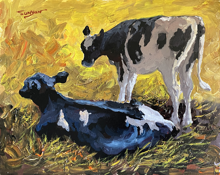 Yan Sun uses bold color and brushstrokes to depict two cows relaxing in the open air. While the various bright warm yellow and orange colors enhance the warmth of sunshine, the dark colors enhance the feeling of leisure and reflection.