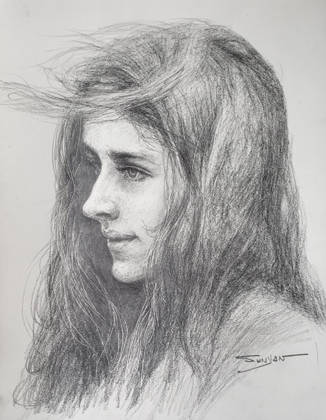 It was a nice and breezy day in Europe when Yan Sun sketched this beautiful girl. The contrast of texture helps emphasize the girl's smiling face.