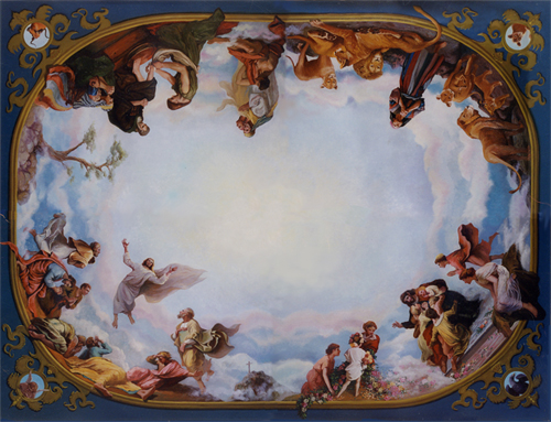 Yan Sun completed each of the stories on four huge canvases that were later installed on the ceiling of a private architecture in Texas. Yan Sun was inspired by the art of Italian artists Michelangelo Buonarroti, Raphael, and Giovanni Battista Tiepolo when he created this painting. He had included some images from the masterpieces by those artists in this ceiling painting.
