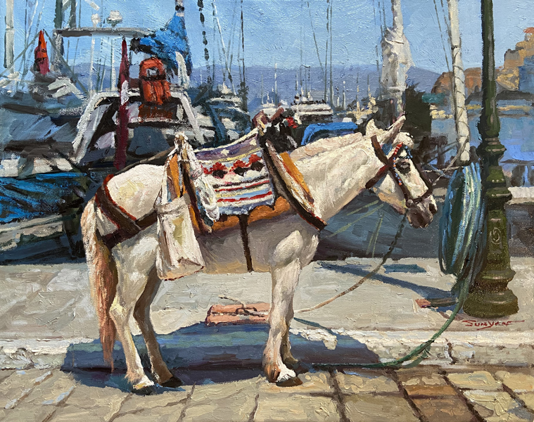 Explore the serene beauty of Yan Sun's oil painting, "A Quiet Moment at the Harbor." It takes you to Hydra Island, Greece, and shows a peaceful moment by the water. In the front, there's a lovely horse, wearing saddles that add elegance. In the background, you'll spot boats on the calm sea and distant mountains. This painting brings a feeling of harmony and quietness.