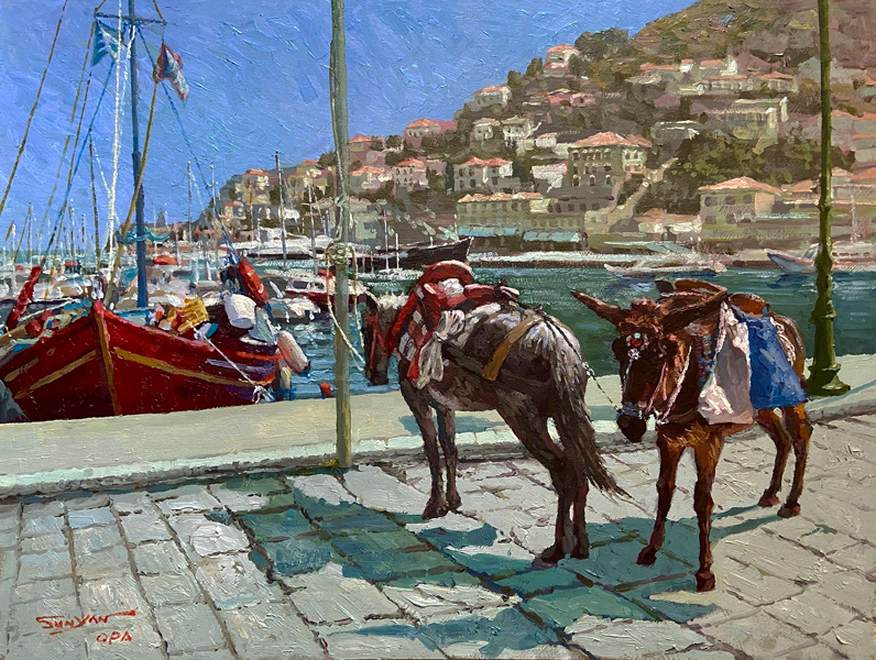 Feel the warmth of the Greek sun in Yan Sun's painting, “Hydra Island Sunlight.” His use of color infuses the harbor scene with a radiant glow, and the presence of the horse and donkey adds a touch of delightful realism.