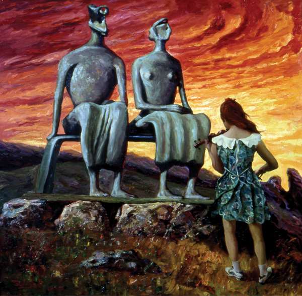 Yan Sun finds inspiration in the masterpieces of art history, drawing deep emotional connections from those remarkable artworks. "Dialog with Henry Moore" is an expressive oil painting by Yan Sun, paying homage to Henry Moore's sculpture, "King and Queen." The artwork portrays a young girl playing the violin before the majestic sculpture, framed against a stunning sunset sky. The painting displays a powerful expression, reflecting the artist's reverence for art's timeless dialogue and the fusion of beauty in various forms.