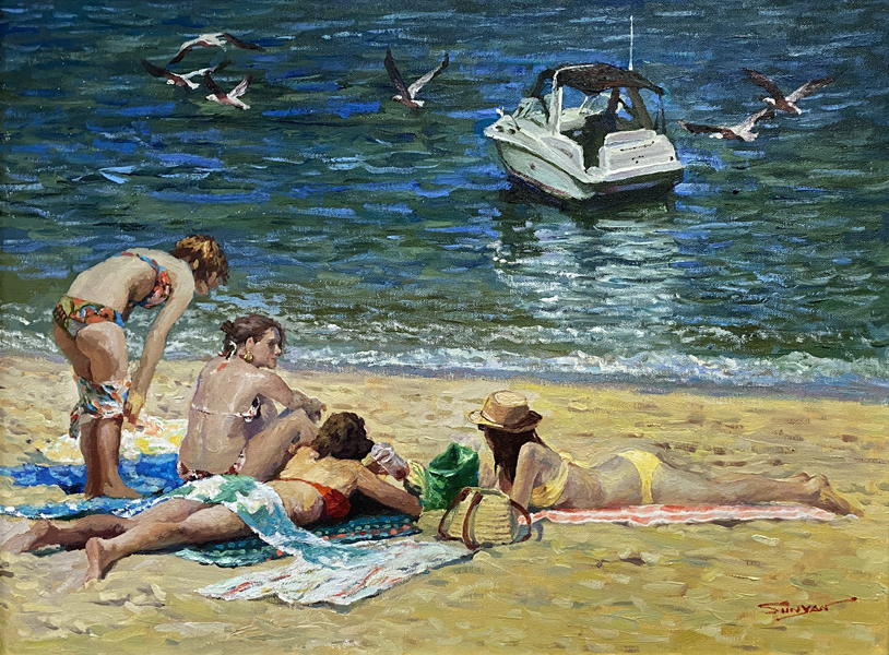 Yan Sun's Enjoying the Beach captures a lively shoreline with friends enjoying their time by the water, accompanied by seagulls with a sailboat in the background. The artist's oil painting techniques bring dynamism into the composition, where sparkling waves meet the sandy shore. The vibrant colors and dynamic brushwork enhance a sense of joy. The inclusion of seagulls adds a sense of courage and freedom.