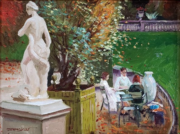 The scenery of Paris provided Yan Sun with exciting views to paint. What dominates this painting is the tranquil atmosphere. Three ladies are enjoying their leisure time in the garden in a warm afternoon when leaves are turning colors. It's a typical painting of this style for Yan Sun.