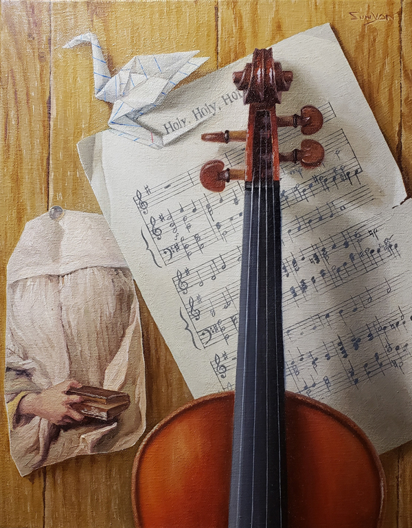 The oil painting "Holy, Holy, Holy" by Yan Sun was featured in the "Virtuosos of Oil Painters of America" exhibition and had received Award of Excellence at Salmagundi Club, New York. It has a harmonious asymmetry in composition that has a strong feeling of equilibrium. In this painting, the depiction of the violin and the music sheet is characterized with intricate details. Although Yan Sun's artworks are created at a certain time and in a specific cultural context, the beauty of design gives the audience an inspiration that lasts through the ages.