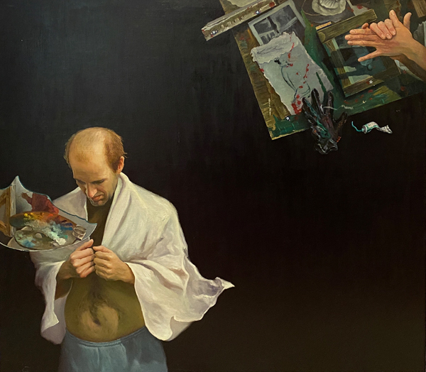 In this painting, the self-portrait part is not very apparent because Yan Sun only painted his hands making shadow puppets. He also painted a portion of himself and his color palette in the reflection of a broken mirror. We can almost imagine the strong relationship between such a quality and the artist’s situation at that time. It was not that the artist intentionally distorted or contorted the images; his goal was to seriously examine and visualize his dream, thoughts, and emotions. To accomplish the visualization, he had created an artistic conception that is supported by interweaving and inverting time and space. Also, it is corroborated with a strong, mysterious contrast of brightness and darkness.