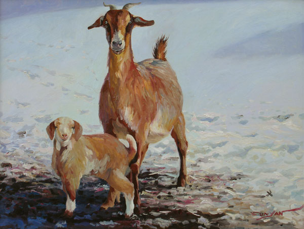 Yan Sun skillfully employs styles and techniques cultivated from his close observations of his surroundings. For instance, "Mom and Child" (goats) was inspired by a tender winter moment when he felt love and warmth, infusing these emotions into his art. The oil painting's composition is elegantly handled with simplicity, displaying color harmony that enhances its subject.