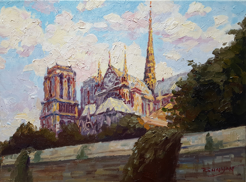 "It's such a heartbreaking day. I feel extremely sad about what had happened to Cathédrale Notre-Dame de Paris," said artist Yan Sun when he watched the reads about Notre-Dame Cathedral fire. Yan Sun created Cathédrale Notre-Dame de Paris when he visited Paris. He created this plein air painting of the Cathedral on the bank of Seine. The selected viewpoint allowed Yan to include the bell towers and the spire in his paintings. It is very painful to see the spire burnt down because Yan loves Notre Dame Cathedral so much.