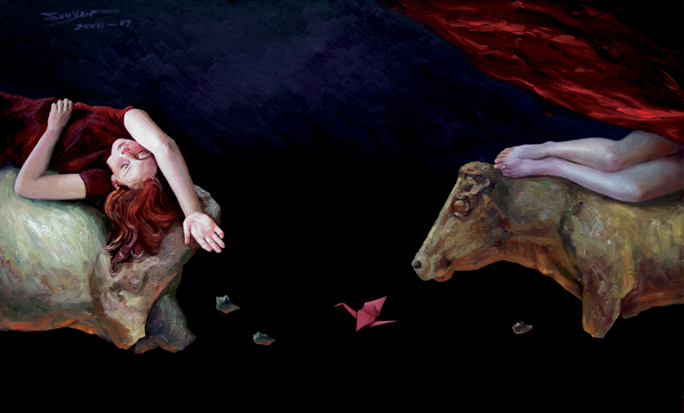 Yan Sun’s inspiration of Red Cloud, Illusion of My Studio, and Wind are from the philosophical idea of the universe. Corresponding to this painting, each audience will have his/her own feelings and interpretations. Just like the universe, art has too many things that are impossible to explain. In each composition, the image of the girl is split, but the audience could rearrange the completed image in their minds. Both Red Cloud and Wind are fused with the full spirit and emotion of Yan Sun. They give the audience more opportunities for thinking, imagining, and experiencing. The large areas of grey or black colors in the painting generate a boundless space and mysterious atmosphere.