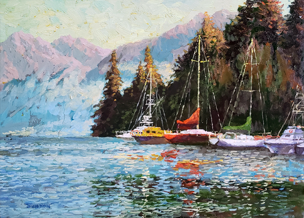 "Summer in New Zealand" is one of Yan Sun's paintings inspired by his many travels. This plein air painting is characterized by free brushstrokes and loose outlines that define the images. The reflections are just amazing as they provide the feeling of the depth of clear water.