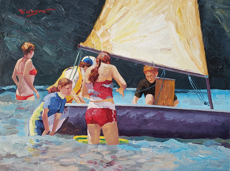 In Yan Sun's beautiful beach painting "Sunshine Coast," there are several young people joyfully embracing the sea and the beach, all gathered around a sailboat. The artist's skilled painting techniques turn a sunny scene into a delightful work of art, where the warm sunshine and sparkling waters invite you to dive into the beauty of the "Sunshine Coast."