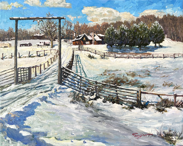 “Winter Farm” is a snowscape farm painting that suggests a feeling of peacefulness and nostalgia. The snow has covered the fields, trees, and farm buildings. This painting represents the serenity and beauty of a farm in winter.