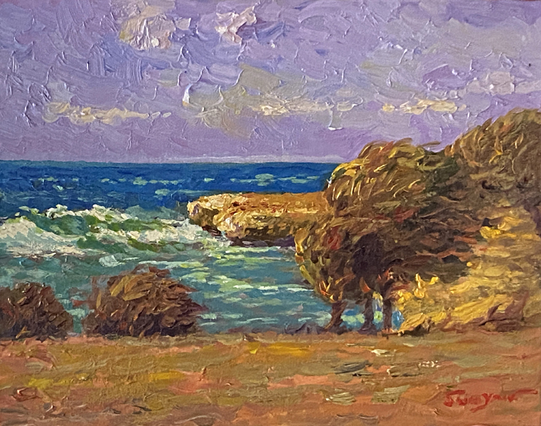 "Gusts by the Seashore" is an oil painting where Yan Sun expresses the dynamic harmony of nature. The windswept sea meets rugged coastal rocks, framed by forceful trees. Yan Sun's technique, combining vibrant colors and delicate brushwork, highlights the merging of these elements. The dynamic interplay in this artwork makes it a great addition for collectors seeking beauty of the coastal landscape.